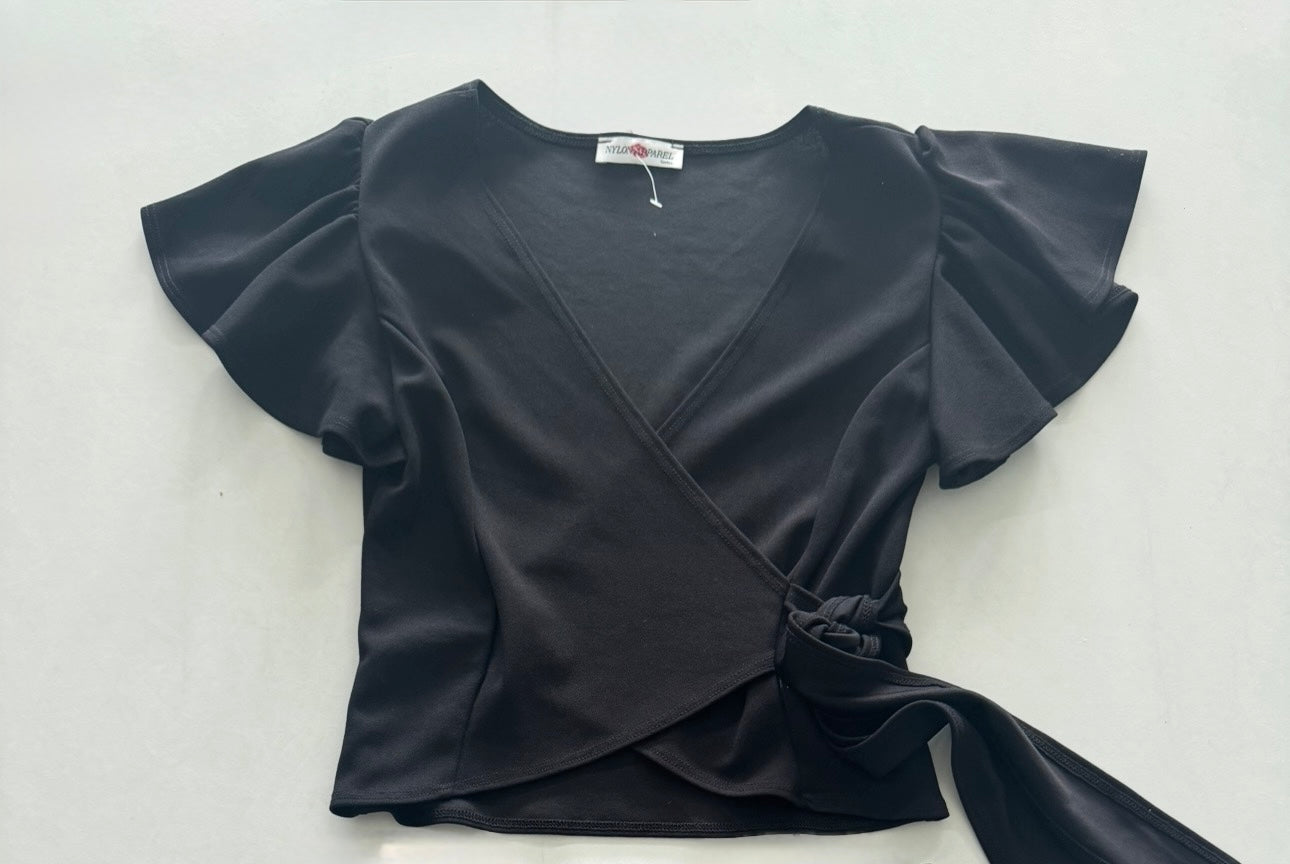 En negro sólido cruza al frente y se ajusta al lado, creando un escote favorecedor que estiliza la figura sin perder comodidad. Sus mangas sueltas le añaden un toque romántico y ligero
